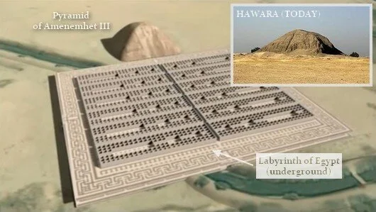 WIKI definition: The Labyrinth of Egypt was a structure, or temple, built south of Amenemhat III's pyramid at Hawara. Not much is known about its use, but it was probably a multifunctional building—with a palace, town and administrative centre. Its complex layout reminded visitors in classical times of the legendary labyrinth of Minos at Knossos in Crete. The site has garnered interest throughout history, and contemporary excavations have unearthed artifacts from both Amenemhat's reign and the Roman era.